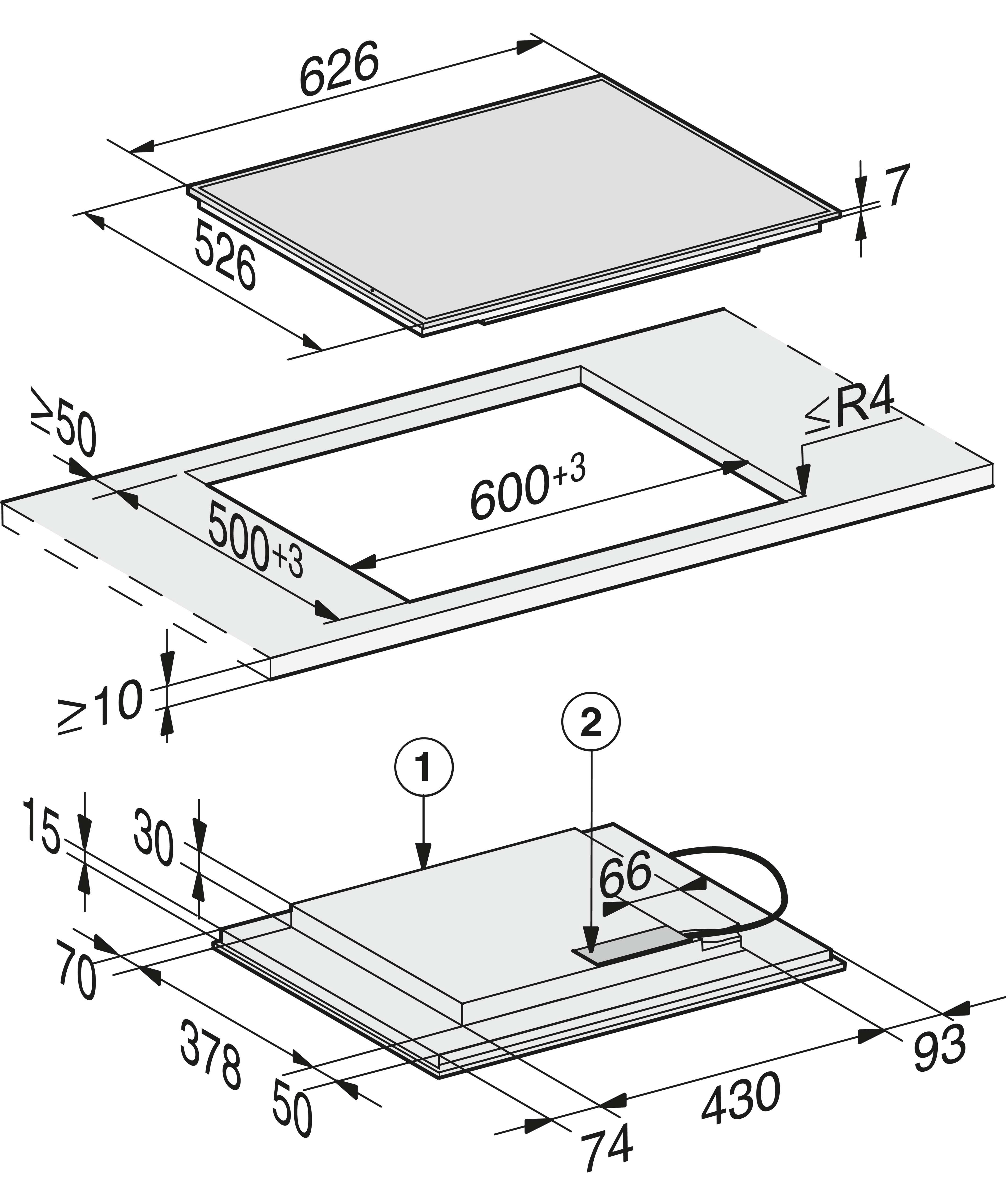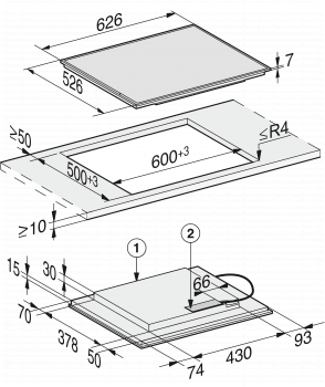 Rozměry výřezu v mm (hloubka) při instalaci bez rámu 500