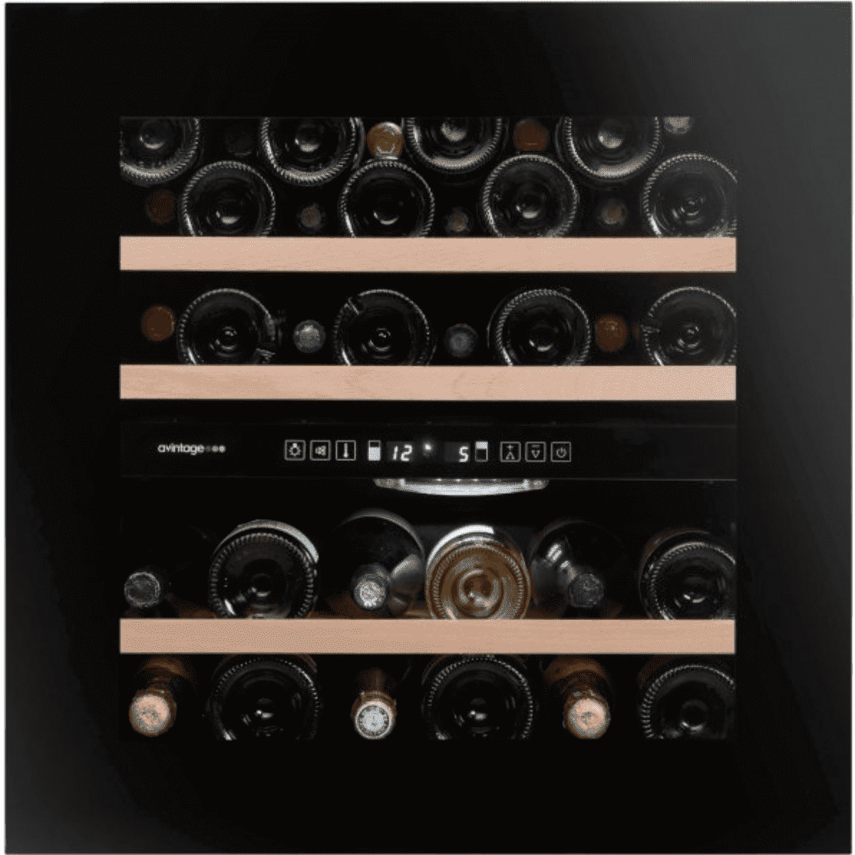 Prémiová vestavná dvouzónová vinotéka značky Avintage; celková kapacita 36 lahví (horní zóna: 24, spodní zóna: 12), rozsah nastavení teplot: 5-12 °C pro horní zónu a 12-20 °C pro spodní zónu; prosklené dveře s rámem z černého piano skla a otevíráním Push-pull; 3 vrstvy tvrzeného šedě tónovaného skla s UV filtrem; černé tělo vinotéky; bílé LED osvětlení s vypínačem; 4 výškově nastavitelné nožky; 2 ks výsuvných dřevěných polic; 1 ks poloviční výsuvné dřevěné police; elektronická regulace teploty; displej v bílé barvě; automatické odmrazování; regulace vlhkosti; systém aktivní ventilace v obou zónách; antivibrační systém; vizuální a zvuková signalizace změny teploty; energetická třída G; klimatická třída N; roční spotřeba energie 142 kWh; použitelná při okolní teplotě 16-32 °C; hlučnost 39 dB; hmotnost 33 kg; rozměry (V x Š x H) 59.5 x 59 x 56 cm