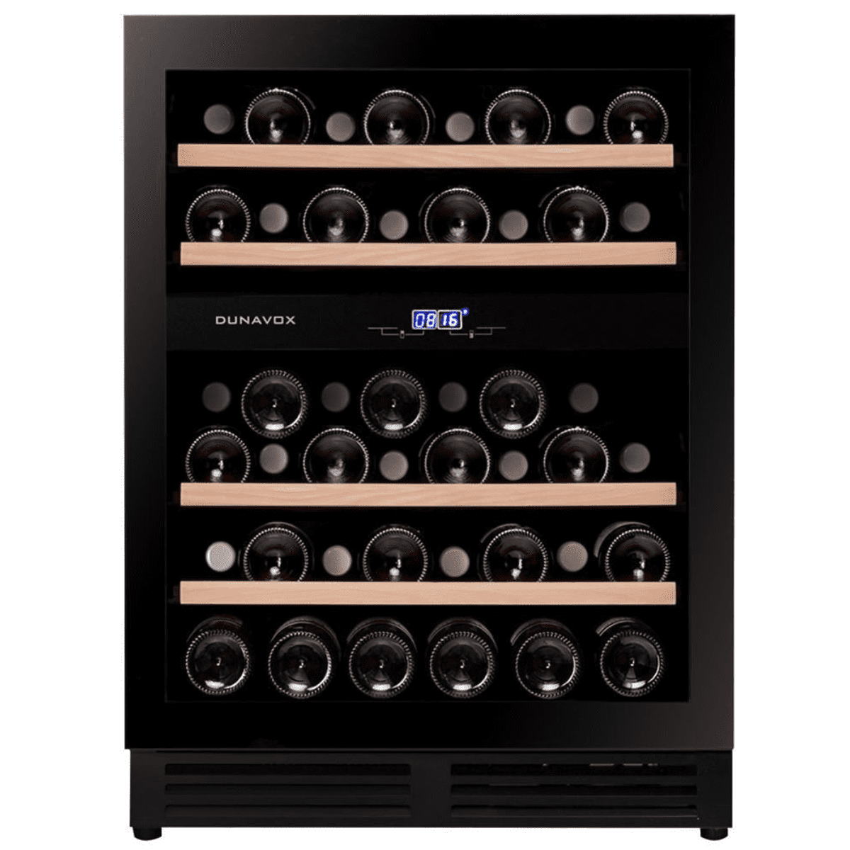 DUNAVOX DAUF-45.125 je dvouzónovou podstavnou kompresorovou vinotékou, jejíž elegantní vzhled ji předurčuje k využití v moderních kuchyních. Tónované sklo i push-to-open technologie otevírání dvířek z ní dělá další specifický reprezentativní model. Dveře vinotéky se otevírají zatlačením do levého horního rohu. Model tvoří kapacitu až 45 lahví vína, které se ukládají na kvalitní dřevěné police vyrobené z bukového dřeva.