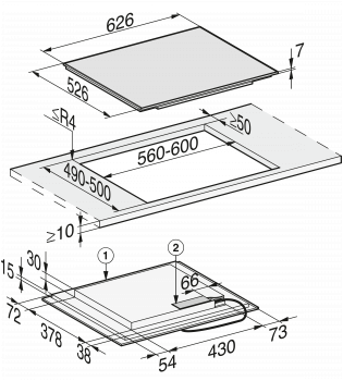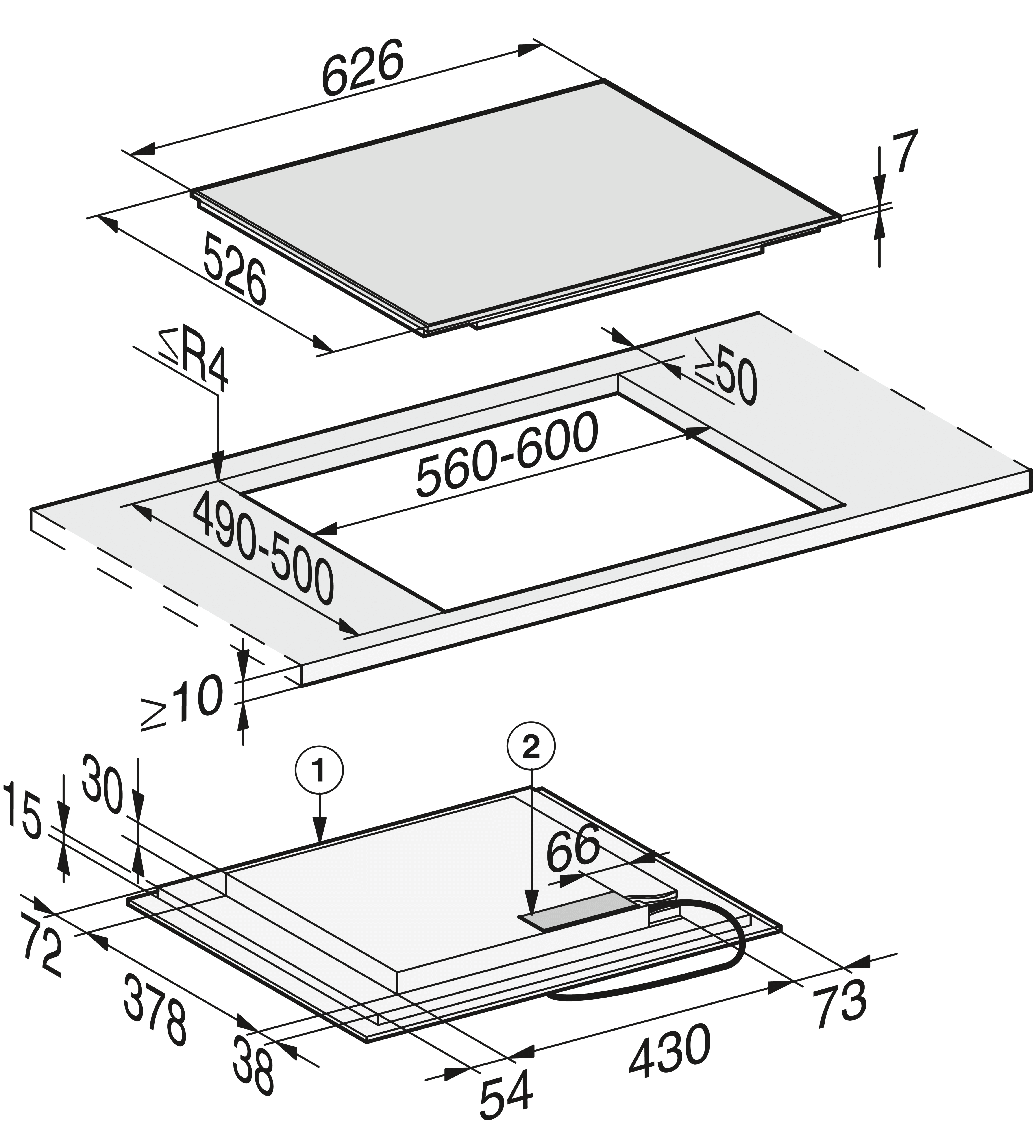 Rozměry výřezu v mm (hloubka) při instalaci bez rámu na pracovní desku