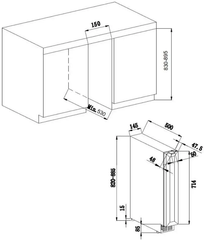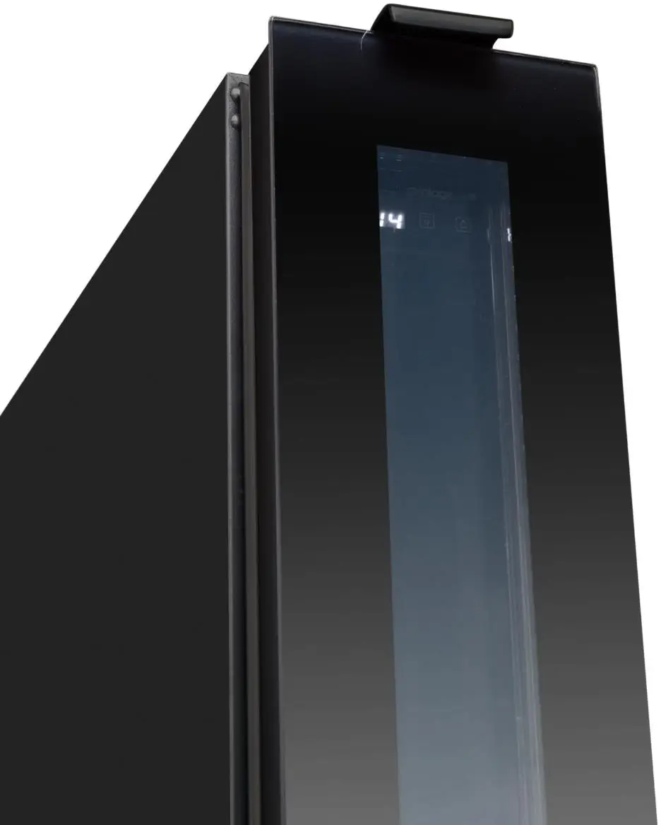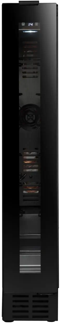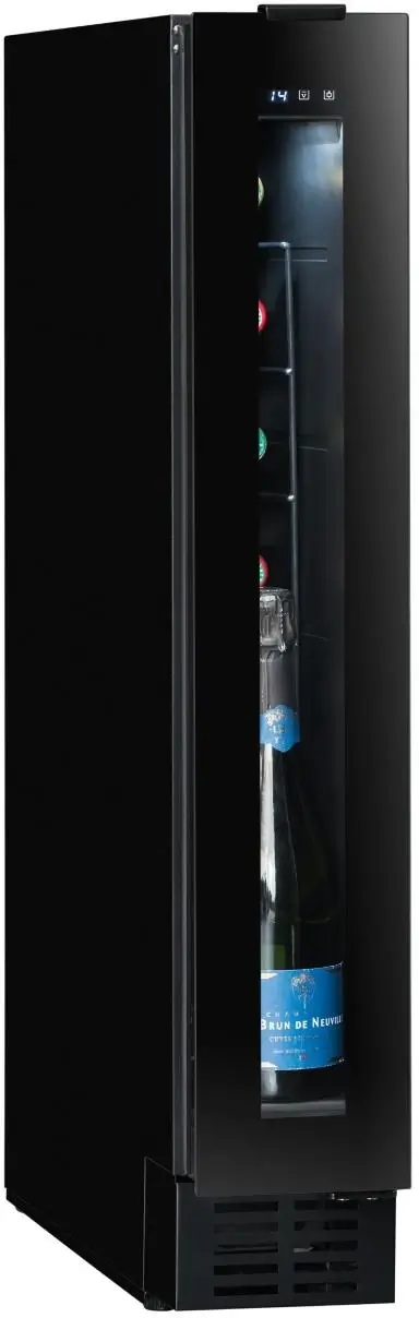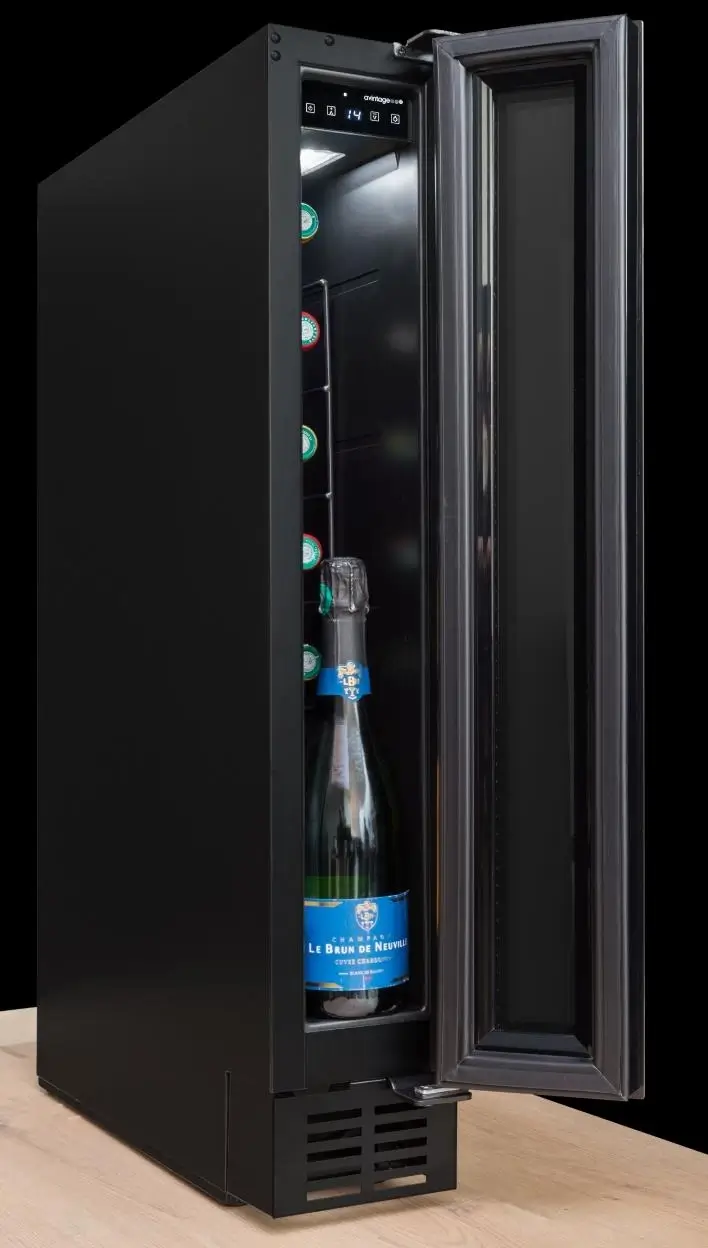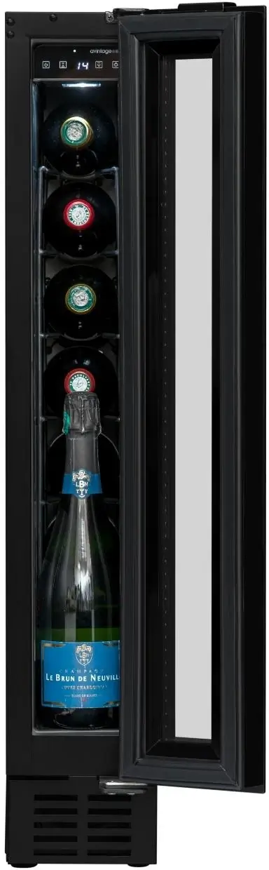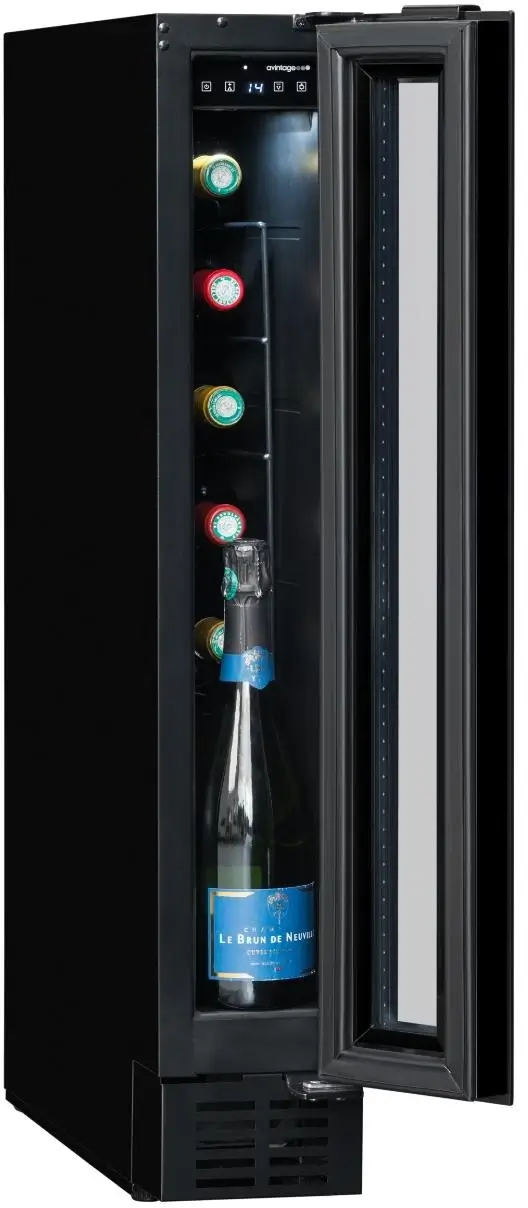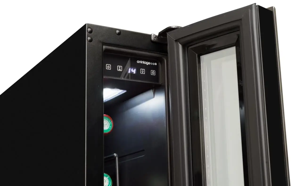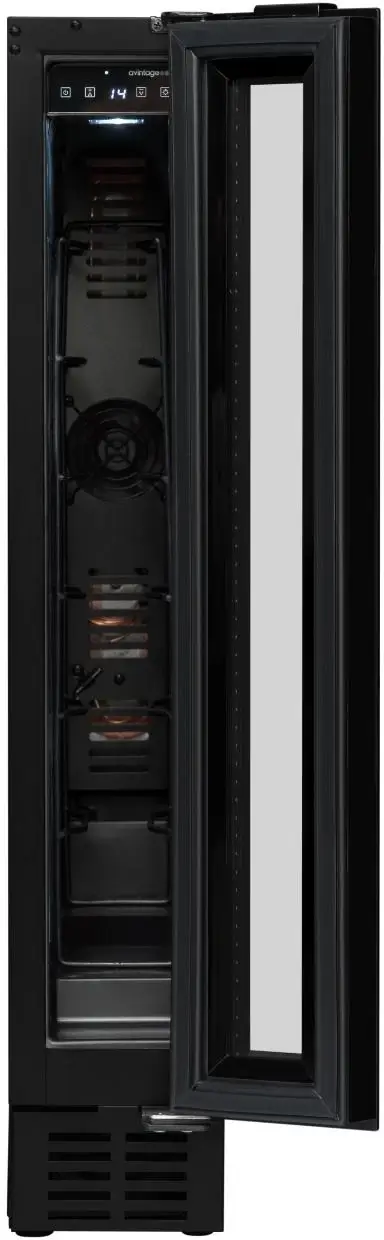 Jednozónová vinotéka značky Avintage s možností instalace jako volně stojící nebo vestavěná pod pracovní deskou; možnost demontáže spodní ventilační mřížky a jejího nahrazení nábytkovým soklem; kapacita 8 lahví, rozsah nastavení teplot 5-20 °C; prosklené dveře s černým rámem a madlem, 3 vrstvy tvrzeného, šedo-černě tónovaného skla s UV filtrem; možnost změny směru otevírání dveří; bílé LED osvětlení s vypínačem; 4 výškově stavitelné nožky; 6 ks pevných kovových polic; elektronická regulace teploty; displej v bílé barvě; systém aktivní ventilace; antivibrační systém; zvukový a vizuální signál zvýšení teploty; energetická třída G; klimatická třída N-ST; roční spotřeba energie 133 kWh; použitelná při okolní teplotě 16-38 °C; hlučnost 39 dB; hmotnost 20 kg; rozměry (Š x H x V) 14,5 x 54,8 x 82 cm